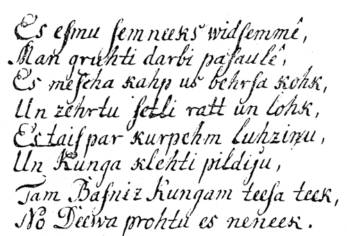Pa kreisi: Dzejolis no brāļu draudzei tuvu stāvoša mācītāja F.B. Blaufūsa 1753. gadā sarakstītā manuskripta „Stāsti no tās vecas un jaunas būšanas to Vidzemes ļaužu”.