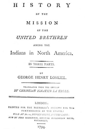 Brāļu draudzes latviešu dziesminieka Juŗa-Indriķa Loskīla slavenās Vidzemē sarakstītās indiāņu grāmatas angļu tulkojuma titullapa.