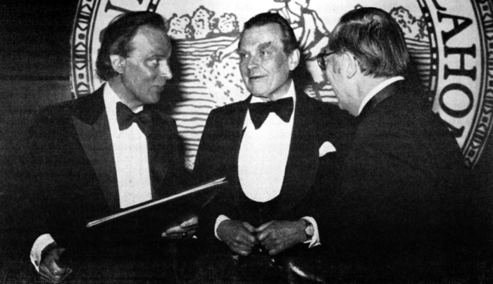 Neustata balvas piešķiršana Česlavam Mīlošam 1978. gadā.No kreisās: Ivars Ivasks (Ivar Ivask), Česlavs Milošs (Czeslaw Milosz) un Oklahomas Universitātes prezidents Pols Šarps (Paul F. Sharp).