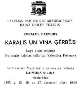 1985. gada nogale. Trīs vakarus līdz pēdējai vietai izpārdotajā Dailes teātrī Laimonis Siliņš no Sanfrancisko Mazā teātra dzīvo Normena dzīvi R. Hārvuda lugā Karaliskais ģērbējs. Daudzi lasītāji šo lugu, droši vien, pazīst pēc līdzīga nosaukuma filmas. Dailes teātrī 1985. gada pavasarī savai jubilejai Karalisko ģērbēju izvēlējās viens no vecākās paaudzes aktieriem Artūrs Dimiters, luga pēc tam palika repertuārā un iemantoja skatītāju dzīvu atsaucību. Tā kā Artūrs Dimiters šajā lugā tēlo izcilo aktieri sēru Džonu, citiem vārdiem sakot, skatuves karali, darbam viņš pārmainījis virsrakstu, un Dailes teātrī tas saucas Karalis un viņa ģērbējs. Tās ir psiholoģiski smalki izstrādātas epizodes no ievērojamā aktiera un viņa uzticamā palīga ģērbēja Normena dzīves. Un grūti pasacīt, kura īsti šajā lugā ir galvenā loma: skatuves slavas apglāstītais sērs Džons vai vienkāršā darba darītājs Normens, kura vārds nav un nebūs minēts nevienā programmā. Laimonim Siliņam viesizrādē piekrita Normena loma, un to viņš notēloja ar atzīstamiem panākumiem. Uz skatuves tiešām bija divi: Karalis − Artūrs Dimiters un viņa ģērbējs Normens − Laimonis Siliņš. Viņu starpā veidojās brīnišķīgas saspēles, sastapās divi profesionāļi, kas izjūt otra darbību un prot to atbalstīt un sekmēt, un tā veidojas ansamblis. Par to L. Siliņu gribas īpaši uzteikt − viņš smalkjūtīgi prata ieliedēties jau iespēlētas izrādes ansamblī, spēja pieskaņoties Dailes teātra aktieru spēles stilam, un nejutām viņu kā izrādes svešķermeni, bet organisku sastāvdaļu.