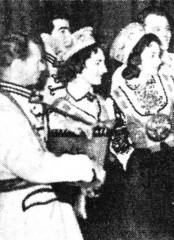 Pilngadības svētki Liepājas rajona Otaņķu ciemā − rajona milicijas priekšnieks Zujāns pasniedz pasi skolniecei Astrai Fridrichsonei. Pa labi komjaunatnes sekretāre Diediške.
