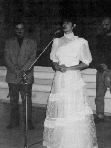 ![]() O. Tillberga izstādē. H. Demakova (pie mikrofona). O. Tillbergs (pa kreisi). Foto: I. Bulmane. |