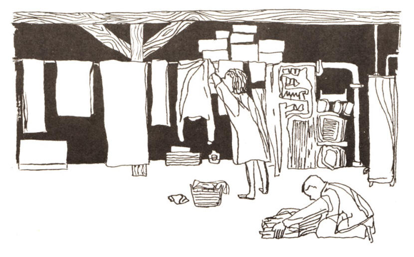 „Kā tu vari sapņot, Artur! Es teicu, lai caurās liek atsevišķi, bet tu esi visu sajaucis.” Sievas seja, izspraudusies caur apakšveļas gabaliem, nolūkojas manī drusku skumji un pārmetoši. Pie apkvēpušajiem pagraba griestiem viena blakus otrai ir novilktas auklas, un uz šīm auklām tagad ir sakārta visa mūsu bagātība: zeķes, zeķturi, bikses, apakšveļa, palagi, izbalējusi sega, divas kleitas. Vienam palagam ir neliels caurums, ko kādreiz neuzmanoties izdedzināju ar cigareti. Kādam kreklam uz krūtīm ir plankums. Tā ir piemiņas zīme no jautrām viesībām pagājušā ziemā, kad pārāk strauji liku dzēriena glāzi pie lūpām. Bet kreklu vēl gluži labi var valkāt pa mājām.