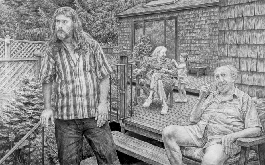 Edgars Jēriņš. Andersoni pie savas mājas Gardensitijā, ASV (Garden City). 2005. Ogle uz papīra. 160 x 254 cm.