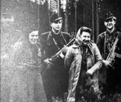 ![]() Pretpadomju partizānu vienības locekļi Sinoles mežos pie Gulbenes (1950) |