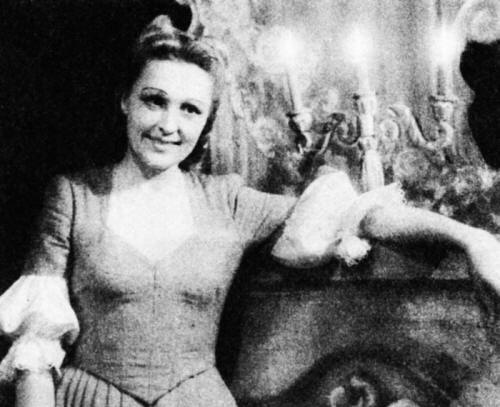 ![]() „Kur ir Tava brīnumainā rociņa? Ā! Atlass, zīds un samts.” Kazanova (R. Mucenieks) un Hortenze (H. Gobzine) Anšlava Eglīša Kazanovas mētelī (1947. g.).