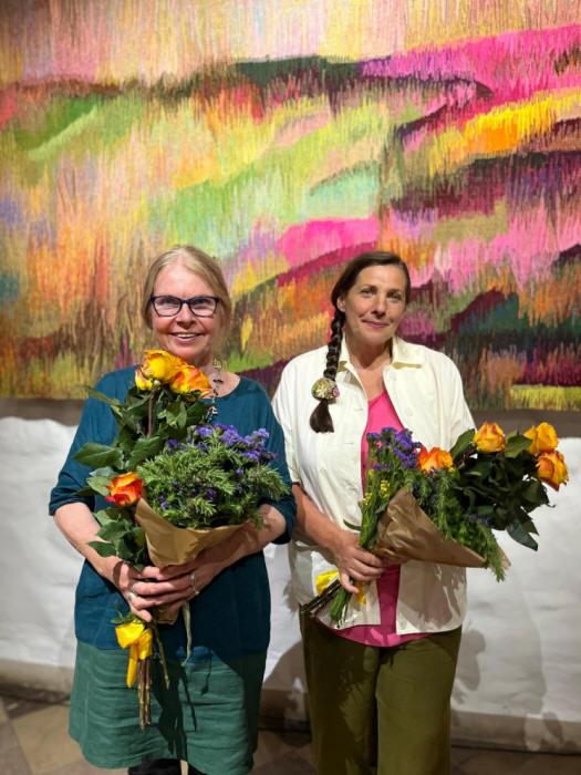 Gobelēnu mākslinieces Ivetas Vecenānes un folkloristes Ilgas Reizniece saruna izstādes „Pļava” gaisotnē.